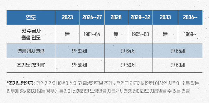 아래의 표처럼 5년에 한 살씩 상향 되면서, 1969년생부터는 만 65세에 국민연금을 받을 수 있게 됩니다. 한 살씩 상향 조정되는 첫 해에는 상향된 나이로 인해 국민연금 첫 수급자가 발생하지 않게 됩니다.