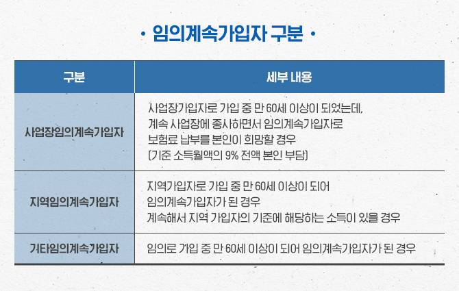 임의계속가입자의 종류는 아래 표와 같습니다.